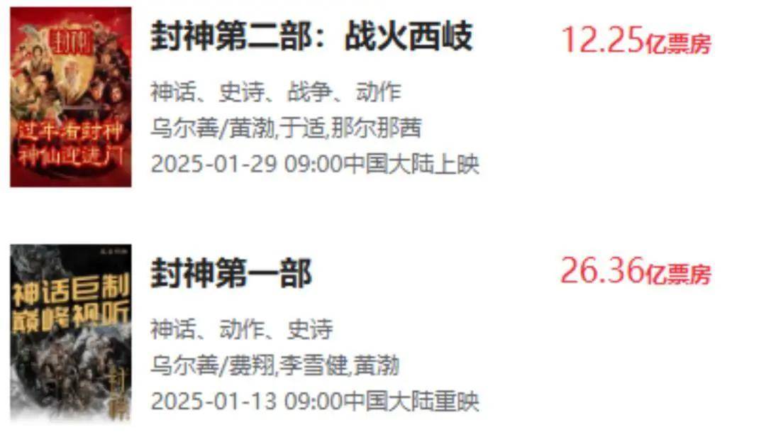 此前,2月18日,据猫眼专业版,电影《封神第二部:战火西岐》密钥延期,延长上映至3月31日。当时,《封神第二部:战火西岐》累计总票房11.63亿。