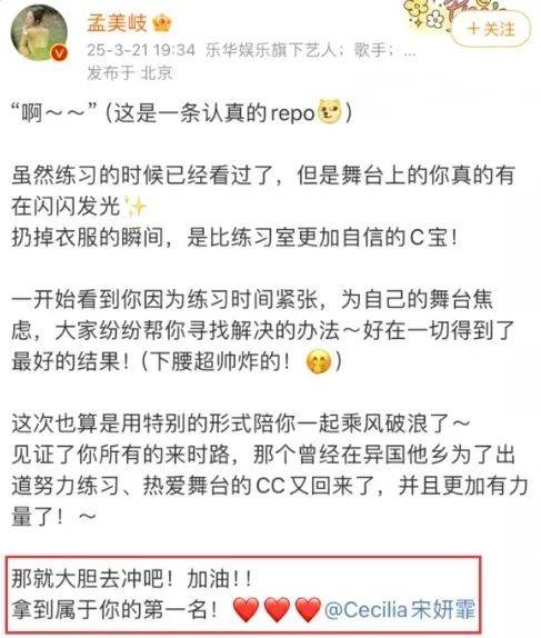 但接下来尴尬的事情发生了,吴宣仪刚刚说孟美岐有事,结果下一秒孟美岐就上线给宋妍霏打call了。