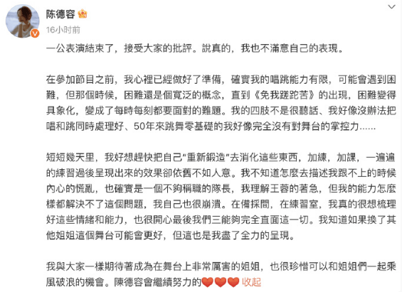 29日上午,陈德容回应相关争议,称:“我接受大家的批评,说真的,我也不满意自己的表现。确实我的唱跳能力有限,我理解王蓉的着急,但我的能力怎么样都解决不了这个问题,我自己也很崩溃,很开心最后我们三能够完全直面这一切。”