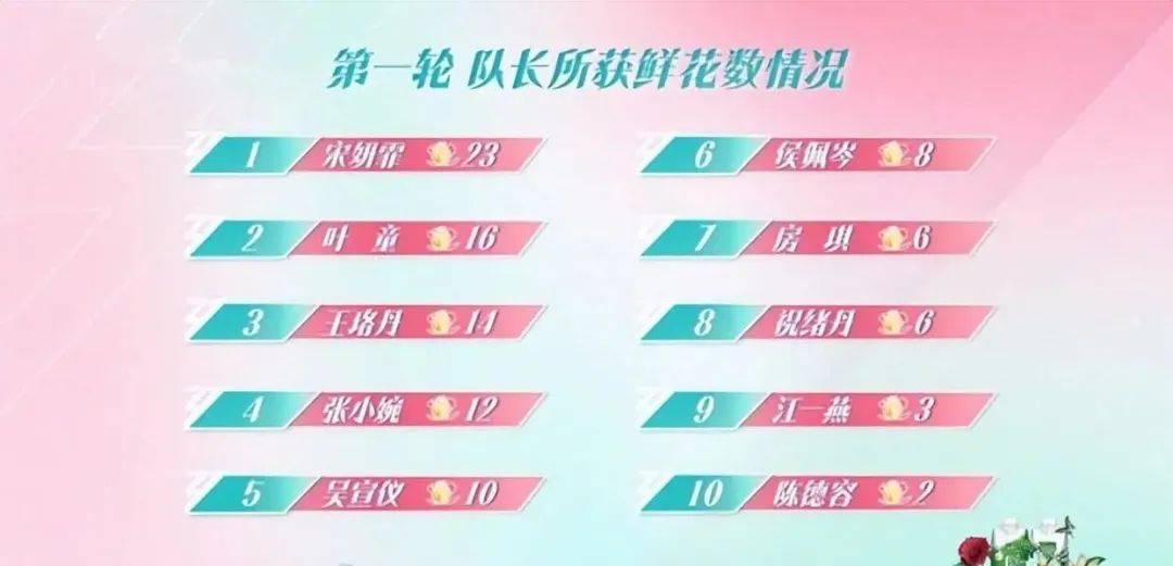 队员先给心仪的队长送玫瑰,陈德容仅仅收到了两朵玫瑰,在队长排名中垫底。反观一旁的宋妍霏,收到的玫瑰多达23朵。