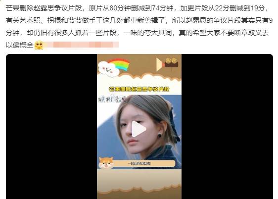 搜狐娱乐讯 29日,有网友发现芒果TV把赵露思的新综艺《小小的勇气》中的争议片段剪掉了!该网友表示:“原片从80分钟删减到74分钟,加更片段从22分删减到19分,有关艺术照、拐棍和爷爷做手工这几处都重新剪辑了。”