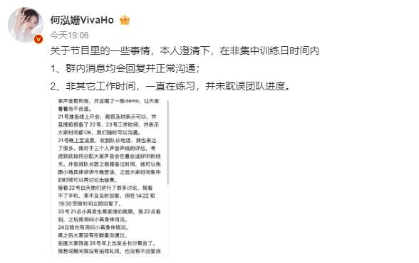 搜狐娱乐讯 29日,何泓姗在社交平台上发文回应《浪姐》节目争议,她表示:“关于节目里的一些事情,本人澄清下,在非集中训练日时间内:1、群内消息均会回复并正常沟通;2、非其它工作时间,一直在练习,并未耽误团队进度。”
