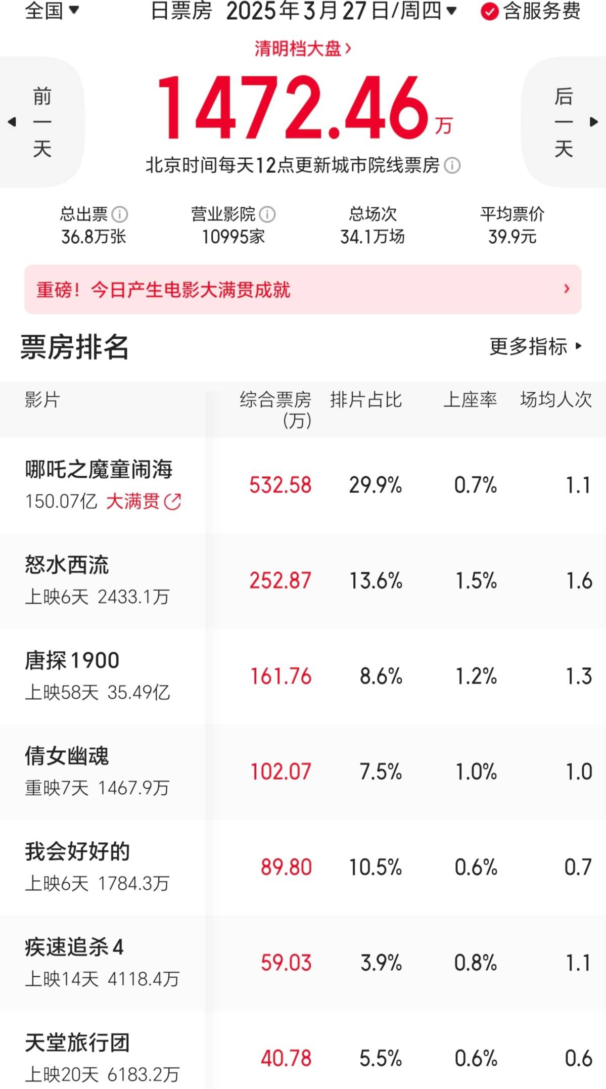 猫眼专业版数据显示,3月27日,全国有10995家影院在营业,排映场次34.1万场,总出票36.8万张,场均人次1.08。连续58天位列单日票房榜首的《哪吒2》场均人次1.1,其他如《我会好好的》《天堂旅行团》场均人次不足1。