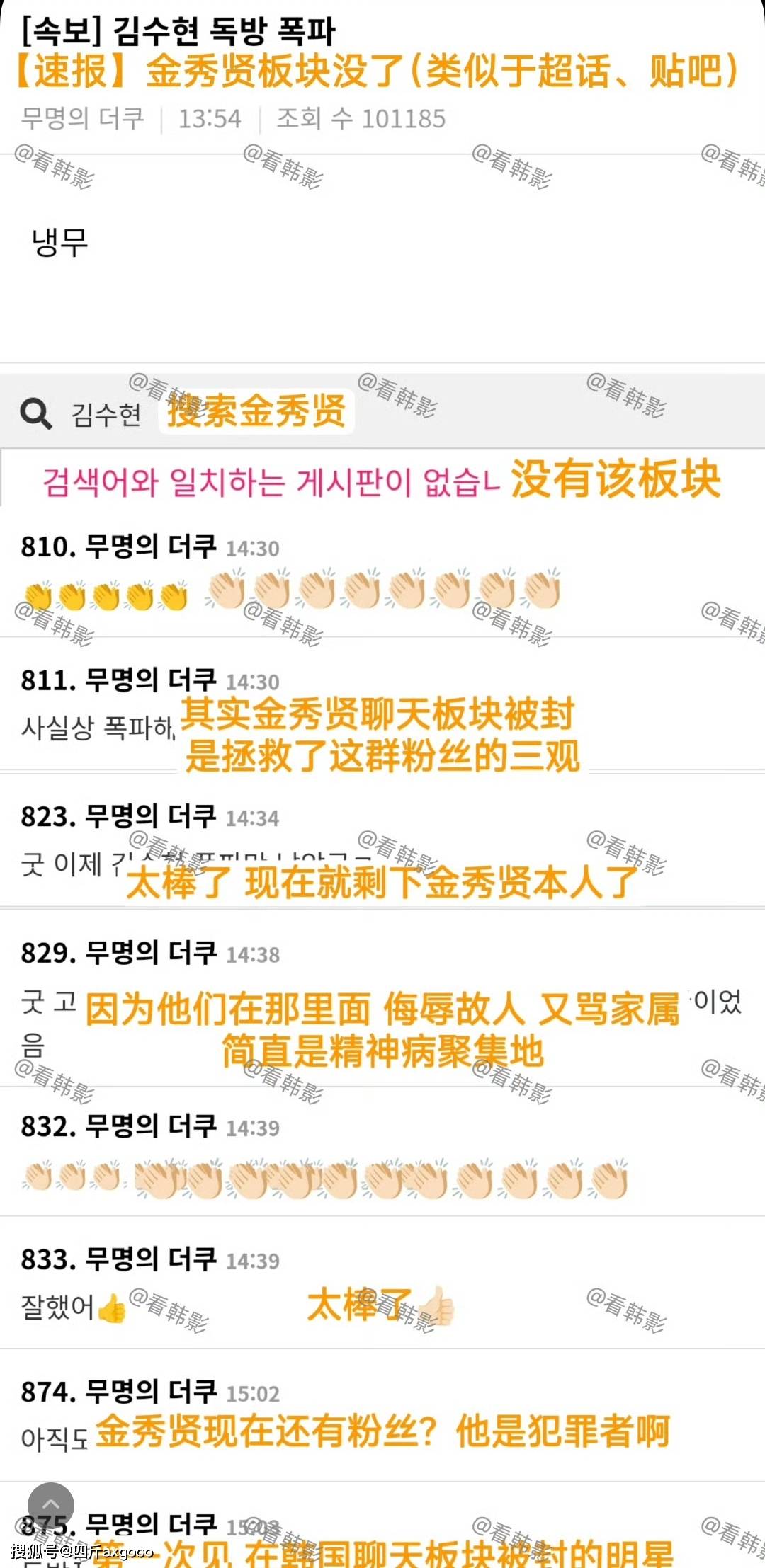 韩国那边的网友发现金秀贤的相关板块已经没有了,类似于内娱明星的超话或者贴吧,已经搜索不到了。