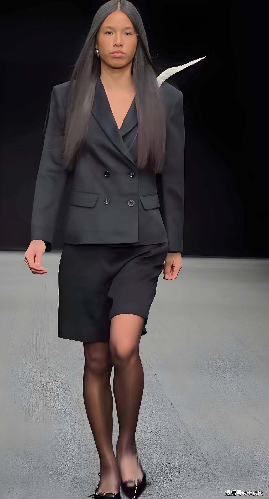 穿着黑色廓形的西装显得非常利落,衬托出林希曈超过1米7的修长身材,同色系高跟鞋和丝袜更是加分,这身材真是超模比例。