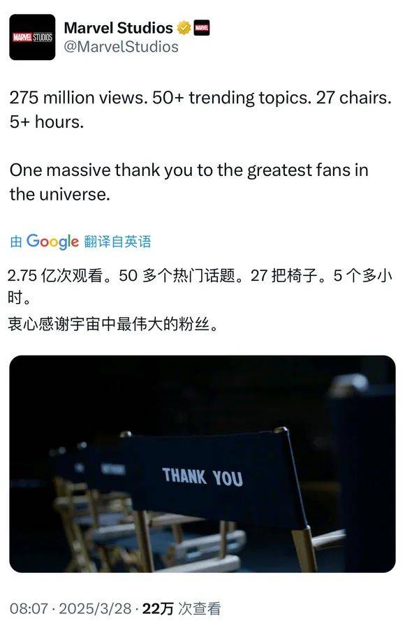 近日,将于英国和《复仇者联盟6》背靠背拍摄的本片,开启了一场长达五个多小时的超长直播,以椅子 演员名牌的形式宣布27人演员阵容。直播至今已收获全平台2.75亿次点击观看,漫威的开机营销相当成功。