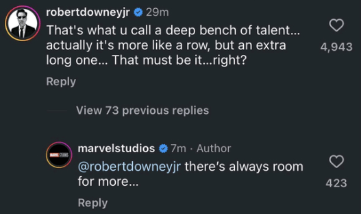 不过由于蜘蛛侠、奇异博士、惊奇队长、绿巨人浩克、银河护卫队成员等前代复联招牌角色的缺席,且死侍、金刚狼等超人气角色不见踪影,想必有粉丝会觉得这次官宣的阵容“平平无奇”——但不要焦虑:漫威影业已经在Ins上暗示这只是首名单,更多惊喜,还在后面。