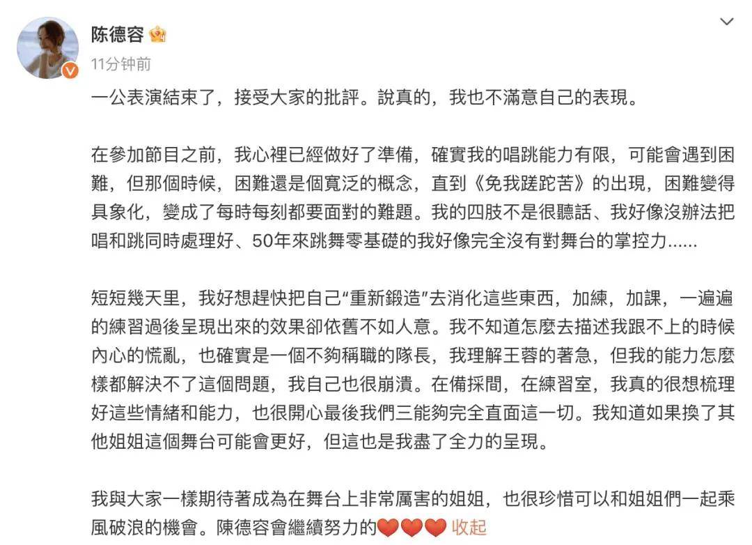 “我与大家一样期待着成为在舞台上非常厉害的姐姐,也很珍惜可以和姐姐们一起乘风破浪的机会。陈德容会继续努力的。”
