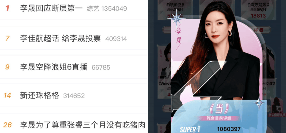 凭初舞台《当》掀动回忆杀,随后李晟(《新还珠格格》小燕子扮演者)被00后网友封为 #民间格格# 并鼓动全网打投助其斩获官方投票断层第一,再到近日 #李晟第一# 、#李晟回应断层第一# 、#李佳航超话 给李晟投票# 等词条隔三岔五就冲上微博热搜乃至热一,李晟之于这季《浪姐6》多少有点“第二个王心凌”的意思。