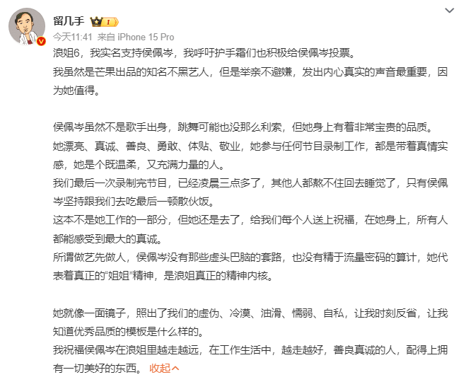 搜狐娱乐讯 近日,博主“留几手”发文呼吁大家为“浪姐”侯佩岑投票,称其代表着真正的“姐姐”精神,是浪姐真正的精神内核。