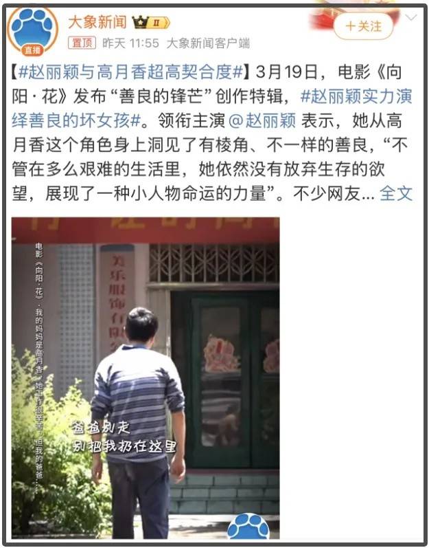 不过,《向阳·花》还没有上映,就引发了一场不小的风波,河南某官号大象新闻刊发了一则关于赵丽颖的报道,报道中用赵丽颖的语气说了一些关于角色和电影的看法。