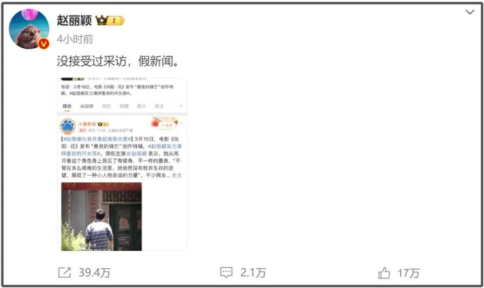 紧接着,赵丽颖转发了这篇报道,并辟谣称自己从未接受过相关采访,直言大象新闻所发内容是假新闻。