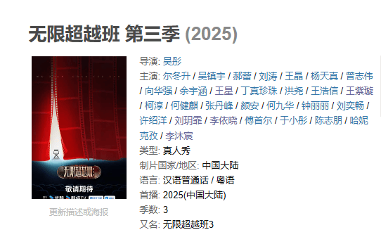 3月25日,综艺节目《无限超越班3》官宣定档,3月29日19:30第0期精彩抢先看,4月5日起每周六20:20,正片精彩上线,浙江卫视上星播出,优酷独家线上播出。截至目前,这档综艺并未官宣嘉宾阵容名单。不过,很多资料平台,已经更新了这次的明星阵容。