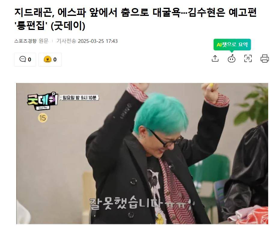 大家好呀,这里是你们的小娱~今天要跟大家聊的是MBC热门综艺《Good Day》的最新预告!权志龙这次可真是遭遇了职业生涯的"滑铁卢",在aespa面前跳舞“翻车”直接被无视,场面一度尴尬到脚趾抠地!