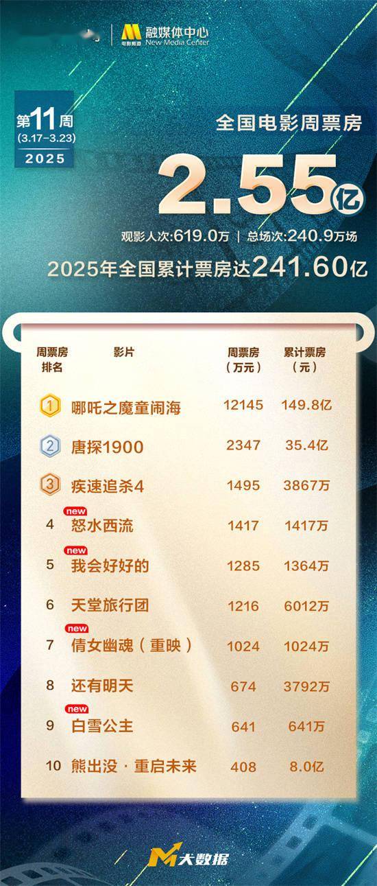 1905电影网讯2025年第11周(3.17-3.23)全国电影周票房2.55亿元,观影人次约619万,2025全年电影票房累计241.60亿元 。