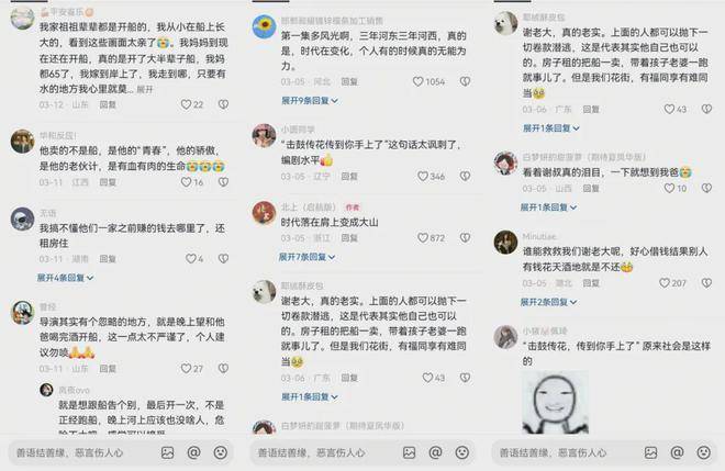 “没有人能够永远赶上时代浪潮”、“时代落在肩上变成大山”,层层压下的债“击鼓传花到了最底层人的手上”……评论区,有运河儿女的“现身说法”,也有新一代对父辈的理解和感同身受。观众们既为他的失意共情,也为他的“执着”而不平。