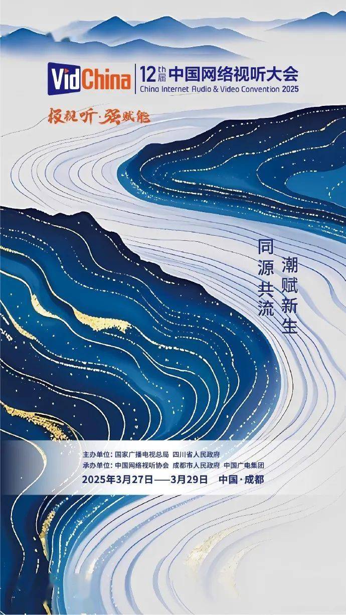第十二届网络视听大会发布主题海报。文脉传承,开放生态,汇聚视听行业之力,以科技赋能内容,以创意激活产业,千川竞流、百业赋能。