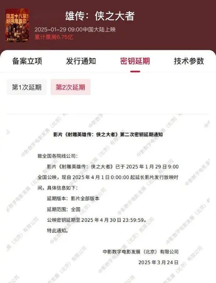 电影《射雕英雄传:侠之大者》密钥延期,延长上映至4月30日。影片由徐克执导,傅若清总监制,肖战、庄达菲领衔主演,梁家辉特别演出,张文昕、巴雅尔图、阿如那主演,蔡少芬特别出演,截至当前累计票房6.75亿。