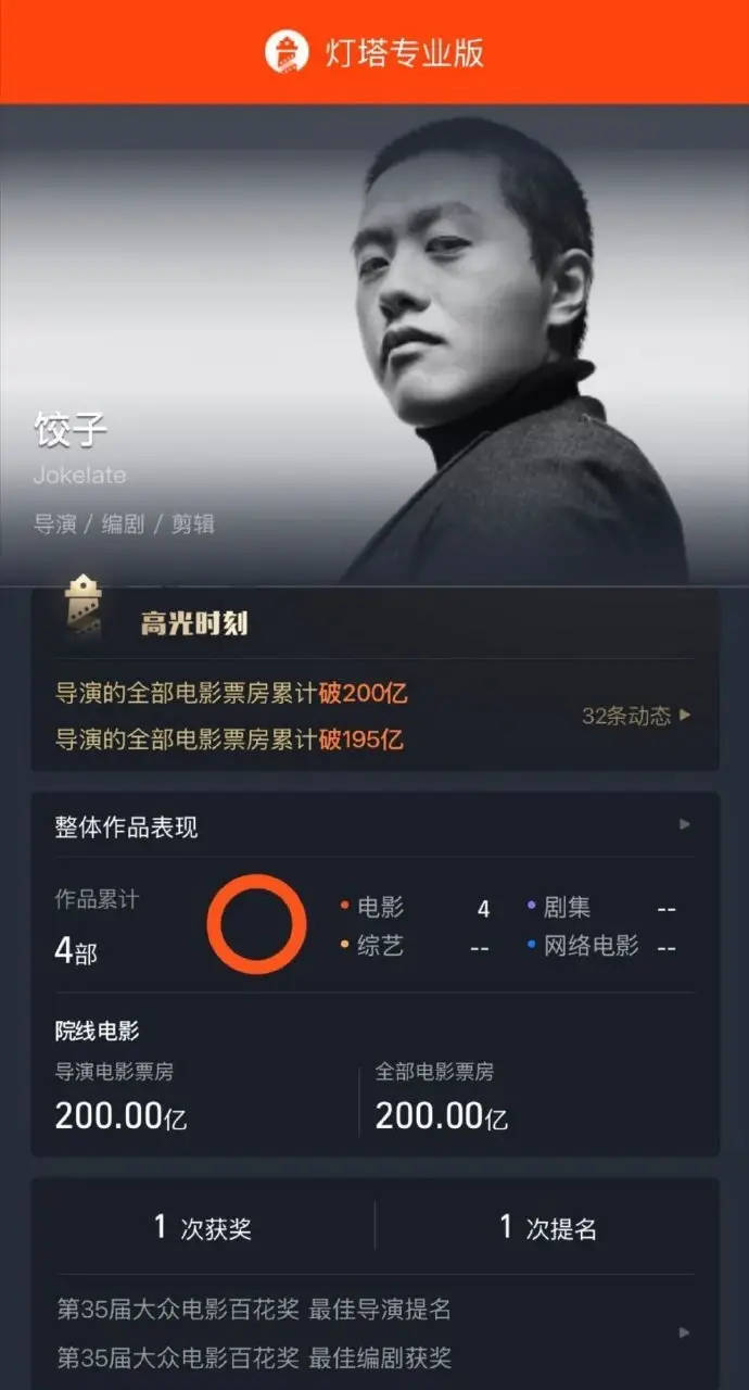 搜狐娱乐讯 3月23日,据灯塔专业版,饺子导演内地票房成绩超200亿元(2部电影),位列导演票房榜第一。《哪吒之魔童闹海》实时票房超149.65亿,哪吒之魔童系列电影内地累计总票房突破200亿,饺子导演成为中国影史首位导演票房破200亿影人。