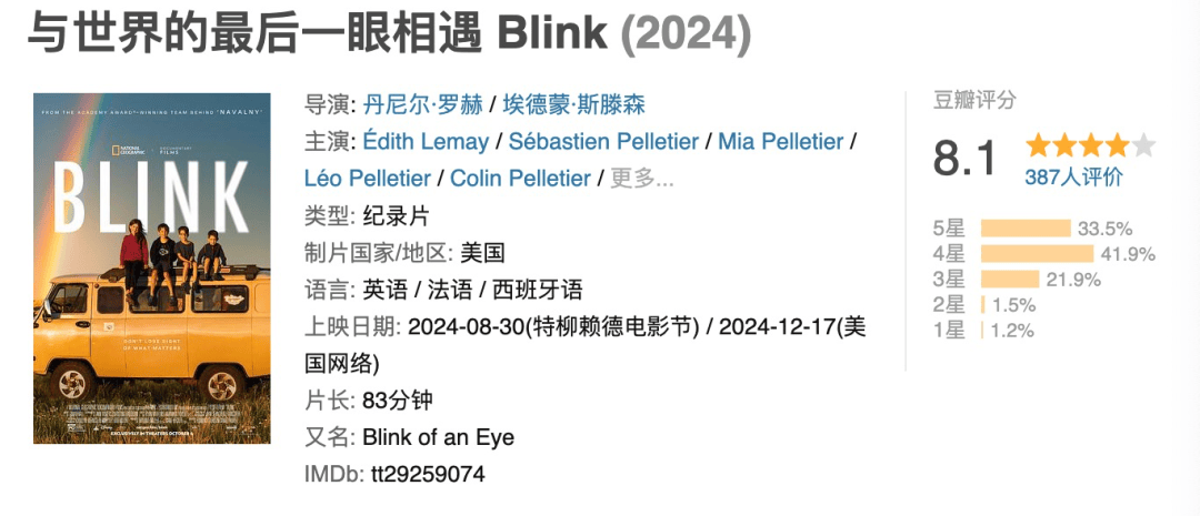 国家地理纪录片,由奥斯卡最佳纪录长片《纳瓦尔尼》团队制作。佩尔蒂埃家是一个快乐、富有冒险精神的六口之家,他们在得知四个孩子中的三个很快将因视网膜色素变性而失明后,决定去环游世界,这是一种罕见的、无法治愈的疾病,会导致永久性失明。一家人开始了一次千载难逢的旅行,趁着还能看到世界上所有的美丽。