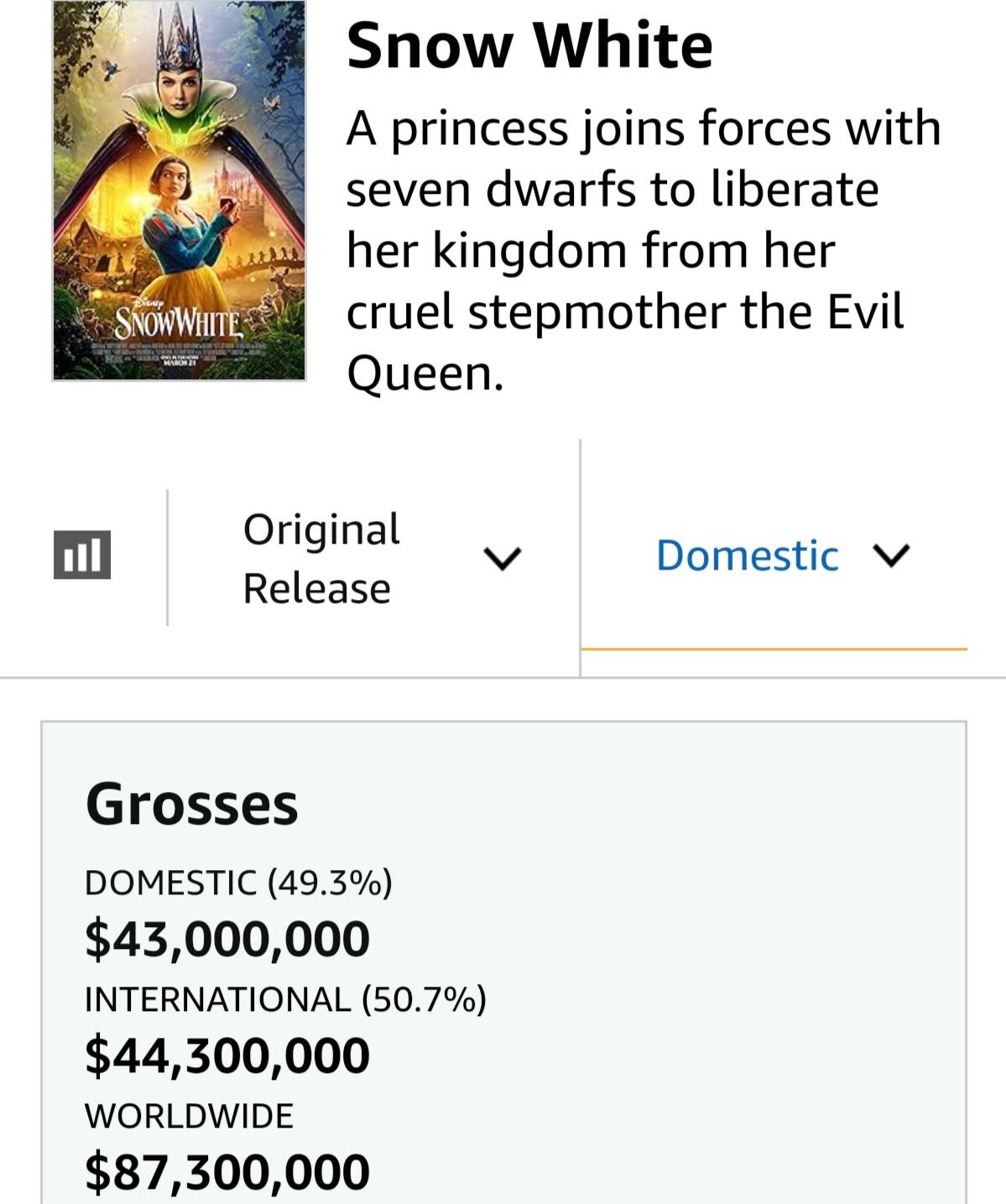 搜狐娱乐讯 (哈麦/文)3月21日,迪士尼大片《白雪公主》上映,首周末三天,在北美本土市场收票房4300万美元,在海外市场收票房4430万美元,其中,中国市场三天票房仅641万元,卖不过《怒水西流》《我会好好的》《倩女幽魂》《疾速追杀4》,严重不及预期。