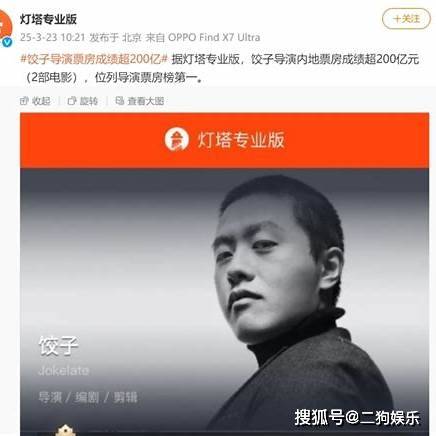 2025年3月23日,著名动画导演饺子(本名杨宇)凭借其执导的三部电影,累计票房突破200亿元,成为中国首位达到这一成就的导演。