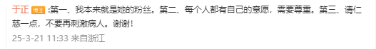 此外,还有网友提到赵露思清空取关列表一事,调侃于正成赵露思粉丝了,对此,于正回应:“第一、我本来就是她的粉丝。第二、每个人都有自己的意愿,需要尊重。第三、请仁慈一点,不要再刺激病人。谢谢!”