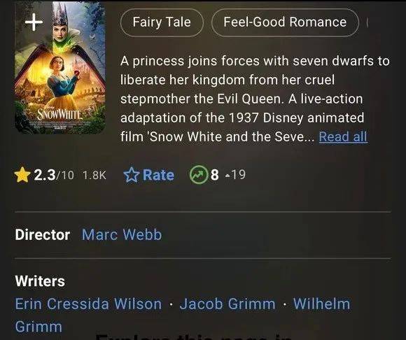 2025年迪士尼的这版《白雪公主》,在剧本上基本就是一个去掉了有趣成人元素的乏味版《白雪公主之魔镜魔镜》,《白雪公主》故事原本该有的浪漫和养眼基本丢光光,改编也既不新,又不有效。