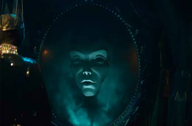 接下来,就是“有眼无珠”的魔镜(真不是玩梗儿,电影里的魔镜是真没有瞳仁)开始夸白雪公主,新王后让猎人杀白雪公主的经典桥段。