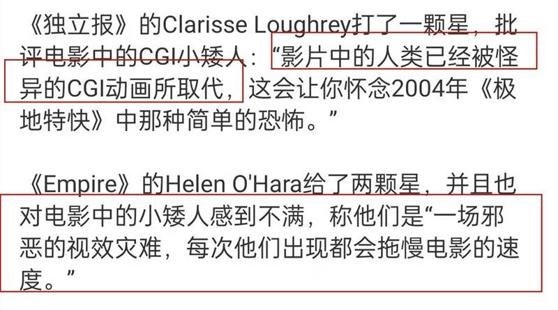 实话说,片中由CG技术制作的七个小矮人,从设定到形象其实都很符合故事设定。但也真的像是外媒所评价的“是一场邪恶的视效灾难”,还有网友吐槽“相当于好莱坞的殷郊”。