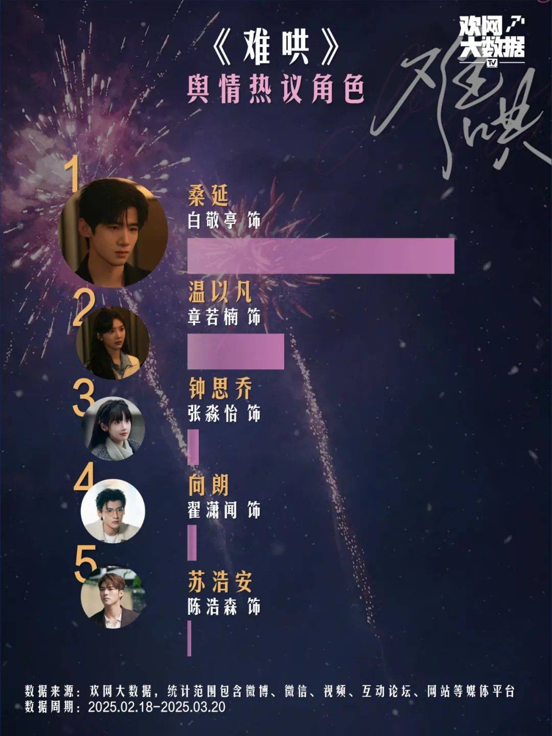 从欢网大数据对《难哄》舆情热议角色分析结果来看,桑延的角色讨论热度高居榜首,温以凡的讨论热度紧随其后,两位主演合力担起了剧集的大部分讨论热点话题。