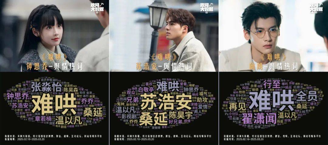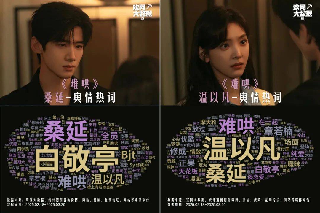 另一方面,陈昊森、张淼怡、翟潇闻等配角的加入,共同构成了《难哄》的“现实宇宙”。这些配角并非工具人,而是通过独立的故事线与主线CP情感发展相交织,既丰富了剧情层次,又强化了都市生活的真实质感。同时,他们的角色也成为主线情感的支点。比如,张淼怡在剧中饰演温以凡的好友,其与温以凡的互动不仅增强了剧情的真实感,还在重要时刻给予了她情感上的支撑,让角色的成长更加令人信服。这一点在欢网大数据角色舆情热词词云图中也可以发现。每一位演员都与剧集角色成为最紧密的强绑定关系。