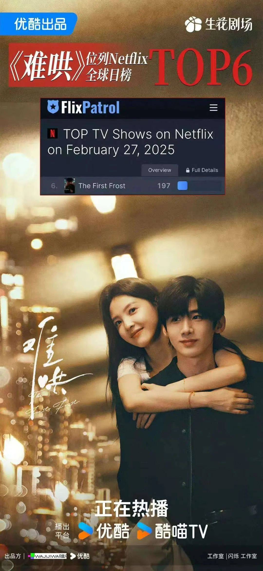 其中《难哄》以破茧之势,成为2024年以来优酷热度破万最快的剧集,更跻身Netflix全球日榜TOP6。这部改编自晋江TOP级IP的剧集,从未播先火,以792万的预约量创造优酷站内现偶预约数新高;到播出期引爆市场——在播期间位居欢网大数据都市爱情剧大屏点播市占率TOP1,12次登顶都市爱情剧大屏点播日冠。成绩斐然!