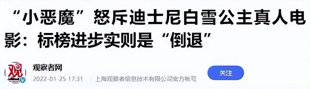她接受采访时,居然对旧版经典动画《白雪公主》不乏批评之辞,认为那里面的王子是一个猥琐的跟踪狂,让白雪公主与他坠入爱河,很不合适。口无遮言的她,立即惨遭全球影迷抵制,就连英国红毯都吓得取消了!
