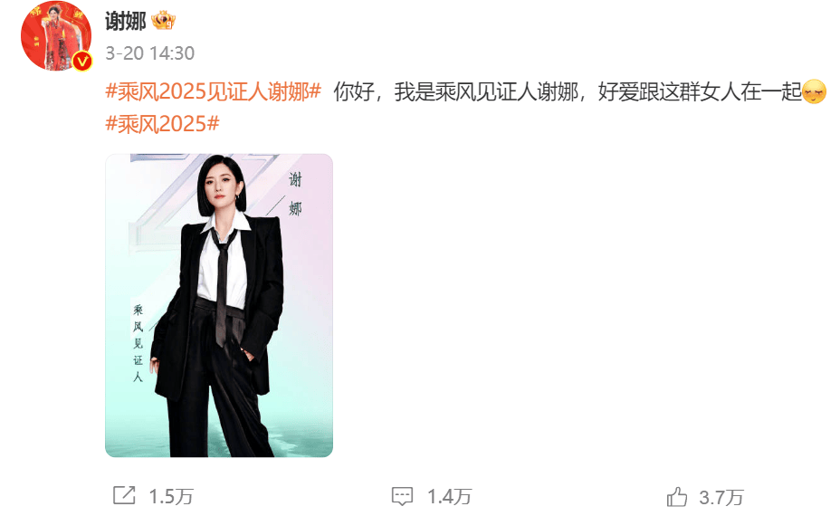 谢娜发布微博官宣自己是乘风见证人的身份。