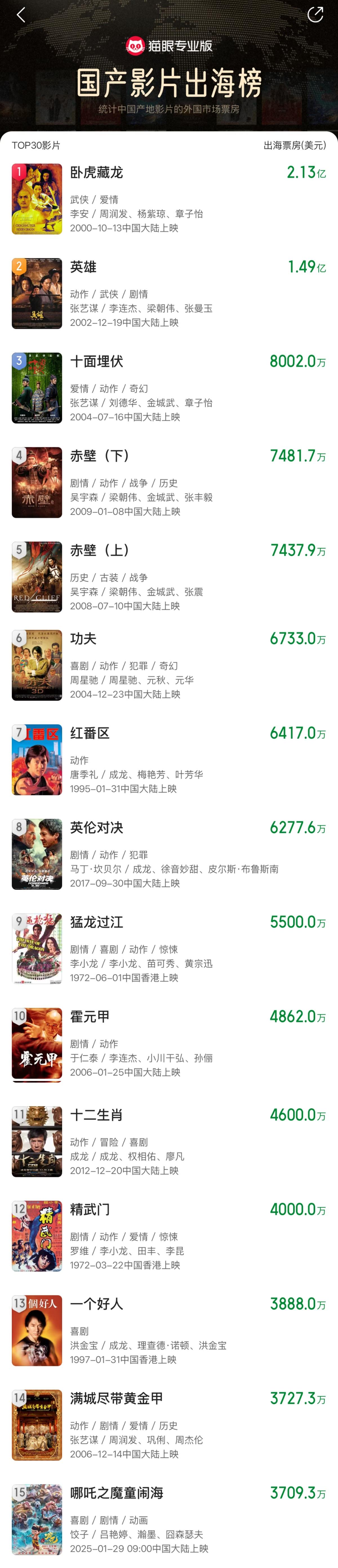 再添新纪录!《哪吒2》进入国产影片出海榜top15 - 超景影院