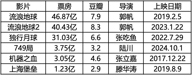 拿目前的数据来看,郭帆《流浪地球》系列如同饺子《哪吒》系列一般,在中国科幻电影,乃至整个华语电影历史中都占有一席之地,但剩下的影片可谓是一言难尽。麻花作品《独行月球》虽然属于科幻类型,但更大的标签还是喜剧,其核心卖点也是沈腾 马丽,并非传统意义的硬科幻类型。