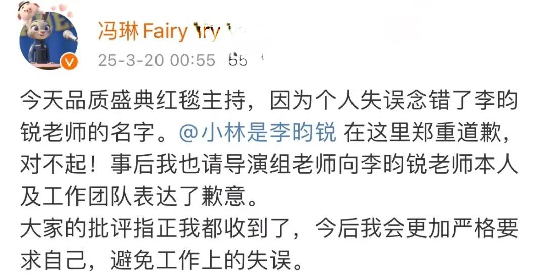 冯琳:“今天品质盛典红毯主持,因为个人失误念错了李昀锐老师的名字。@小林是李昀锐 在这里郑重道歉,对不起!事后我也请导演组老师向李昀锐老师本人及工作团队表达了歉意。大家的批评指正我都收到了,今后我会更加严格要求自己,避免工作上的失误。”虽然也有网友说专业的主持人出现低级错误实在不应该,但起码冯琳态度很端正。