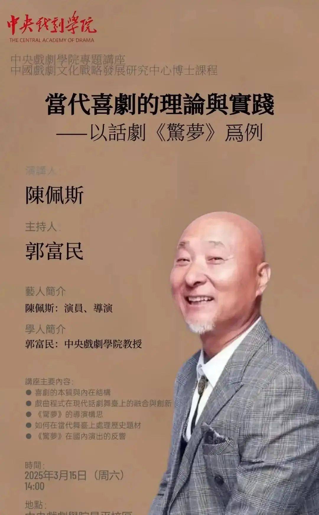 北京下雪那天,陈佩斯受邀在中央戏剧学院开展了一场名为“当代喜剧的理论与实践,以《惊梦》为案例”的大讲座。71岁陈佩斯戴着老花镜,虽然胡子眉毛都白了,但百人讲堂坐得满满当当,连过道的台阶上都是学生。