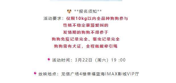 我们看到海门幸福蓝海IMAX影城的某篇招募宠物观影的贴文中,就非常明确写明,“仅限10kg以内全品种狗狗参与,性格不稳定暴躁爱叫的,发情期的狗狗不得参于,狗狗免疫记录完全、驱虫记录完全,狗狗需有犬证,全程佩戴牵引绳。”