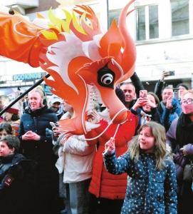2月2日,一个女孩在英国伦敦举行的新春巡游活动上与“中国龙”互动。图据新华社客户端