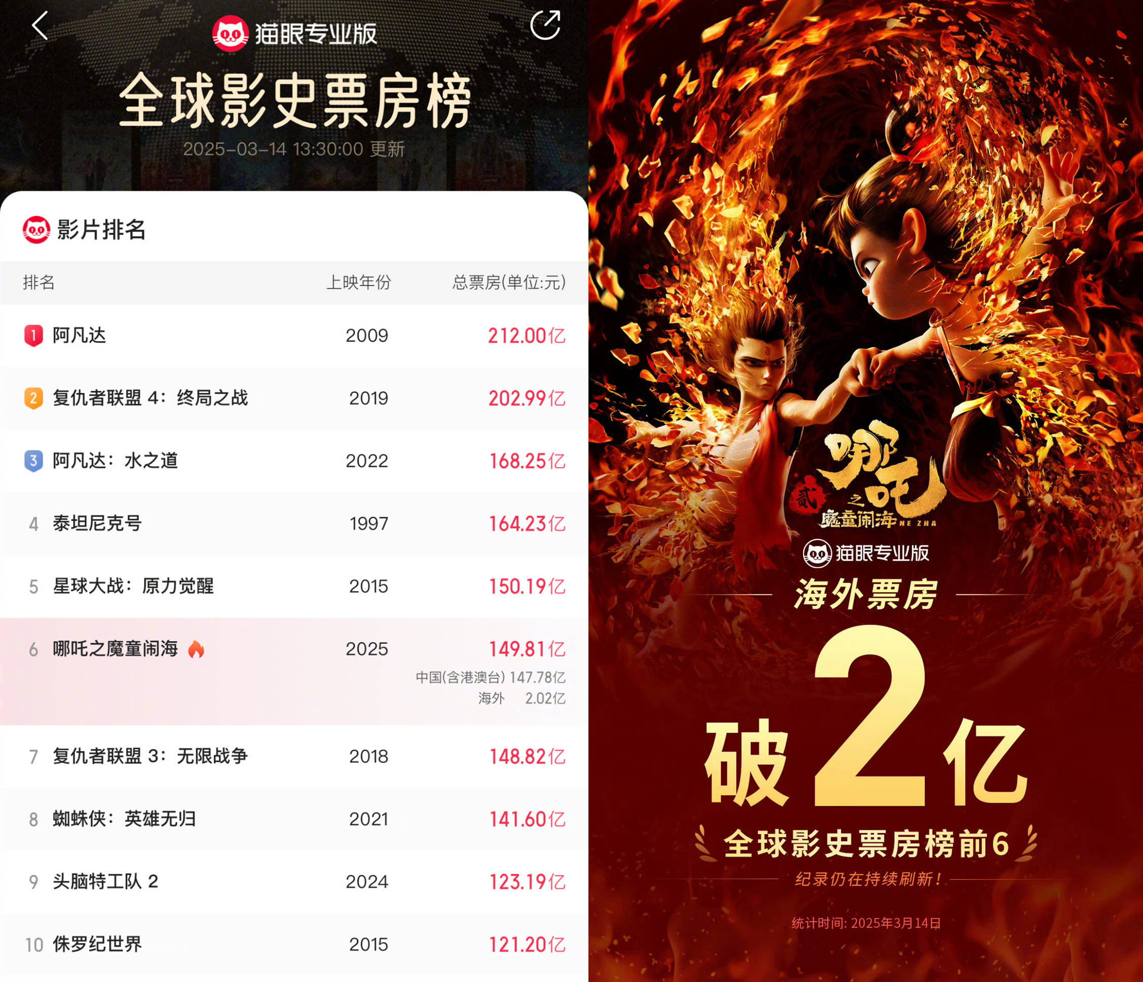 搜狐娱乐讯 据猫眼专业版数据,电影《哪吒之魔童闹海》海外累计票房已突破2亿。截至3月14日13:30,影片全球票房(含预售及海外)已达149.81亿元,即将超越《星球大战:原力觉醒》晋级全球影史票房榜第5位。
