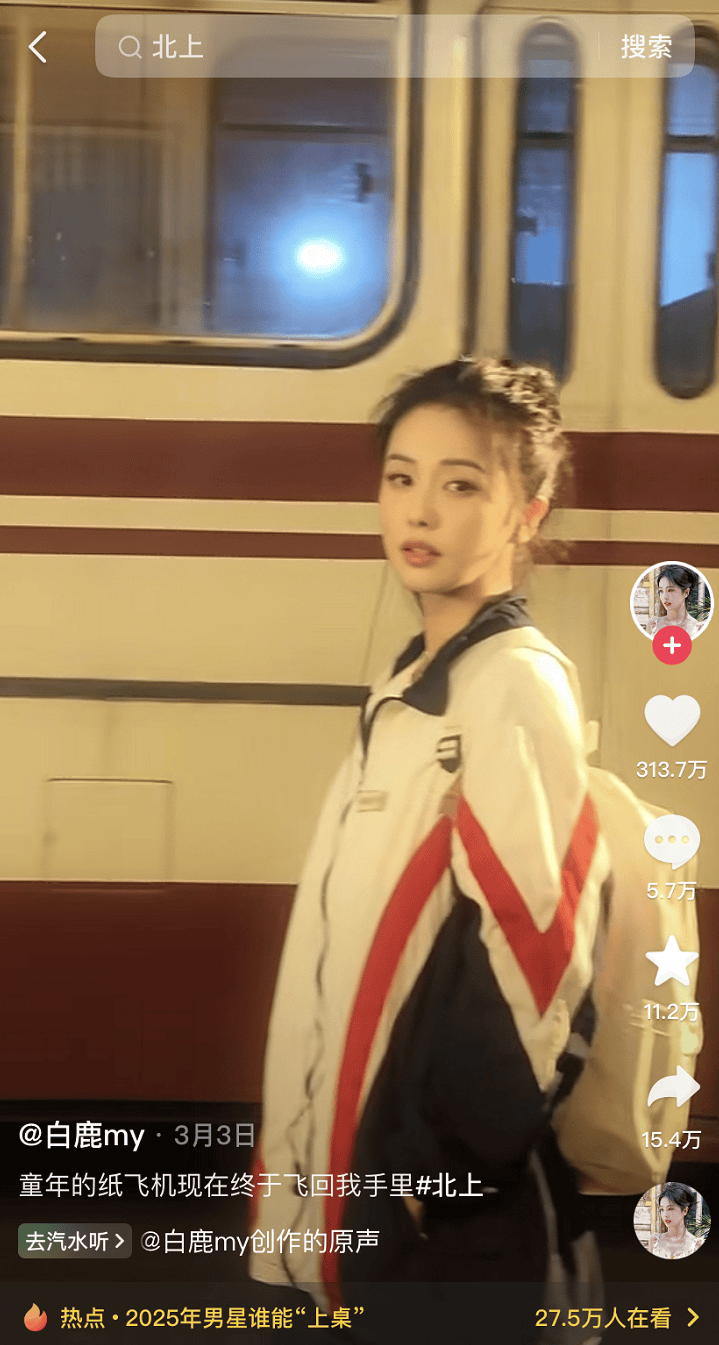 除了与现偶、古偶契合的高糖氛围外,年代剧《北上》播出期间,白鹿发布的一条视频点赞也在300万以上。视频中,步入社会的夏风华(《北上》女主,白鹿饰),向学生时代的她挥手,路过的一辆公交车隔开了两个时空,年代感扑面而来。这也反映出,基于剧集题材差异,营造氛围感的剧宣形式,还有更多值得挖掘的落点。