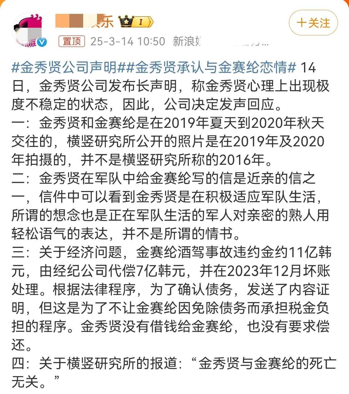 3月14日,据多家媒体报道,金秀贤公司承认金秀贤与金赛纶恋情,但表示两人是在金赛纶成年后的2019年夏天到2020年秋天才交往,那时金赛纶已成年。被曝出的信件也是写给亲朋好友的信之一而已。