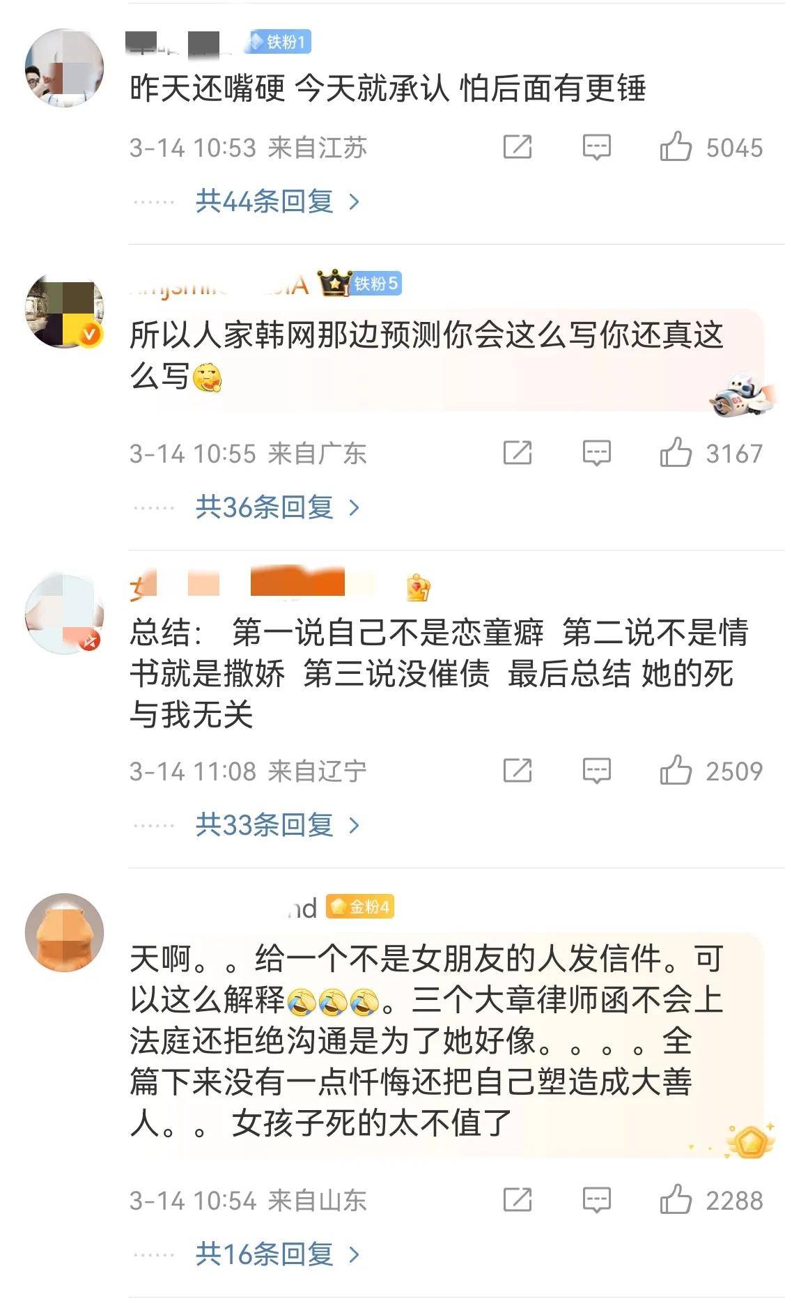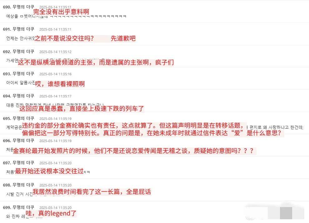 不少网友表示:“的公关感觉就是照搬粉丝的,完全就是虚假澄清”、“符合我对韩男的刻板印象……无意冒犯他人”、“韩剧男主,是最大的韩国骗局”、“为什么说谎 是因为他心虚了!为什么心虚 是因为和金赛纶恋爱是在没有成年的时候本来就是事实”等等。