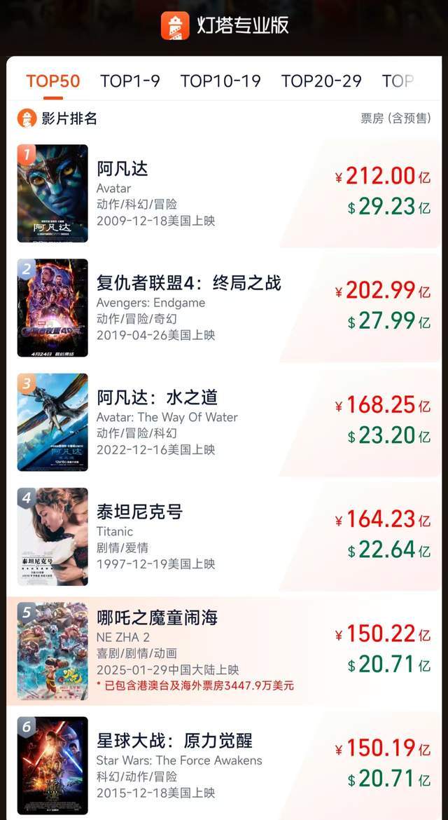 刚刚,《哪吒2》总票房超《星球大战:原力觉醒》,位列全球第五。