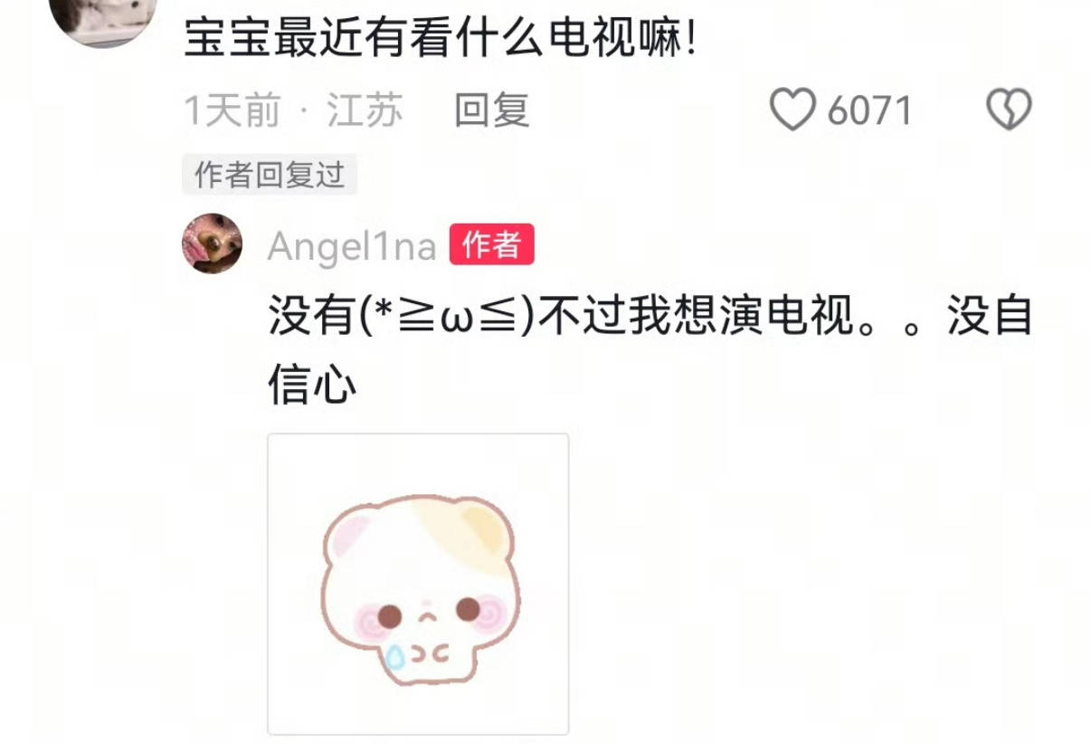 搜狐娱乐讯 近日,有网友在甜馨评论区留言问她“最近有看什么电视嘛”,甜馨表示:“没有,不过我想演电视,没自信心。”不少网友看到后纷纷鼓励甜馨勇敢追梦。