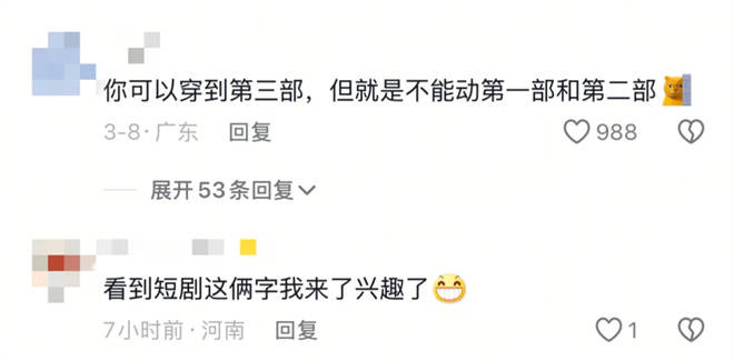 如果说帮助主角团回归原有故事线算是“致敬经典”,那么“当红女星穿书爆改金锁”“崩坏剧情修复”则无疑在努力贴近短剧领域最受欢迎的“爽感”“反套路”等元素。