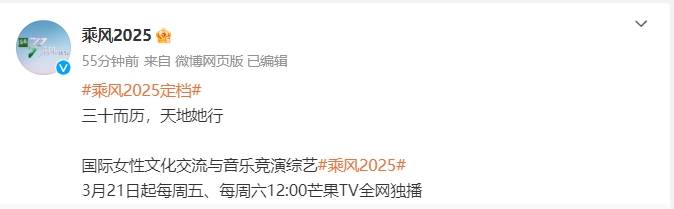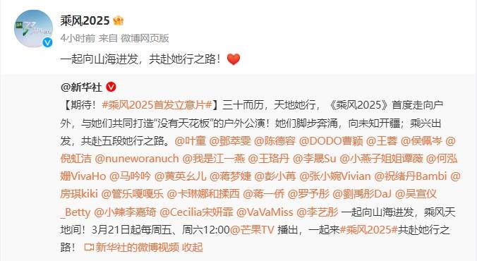 继《再见爱人》以小博大成为现象级大爆综艺后,芒果台另一档名副其实的全民综艺《乘风2025》强势回归,节目于3月19日正式官宣定档,确认从3月21日起每周五、周六更新正片与观众见面。除了宣布播出时间,节目官微还一口气放出了主题曲mv和长达50分钟的超前企划,信息量十足。