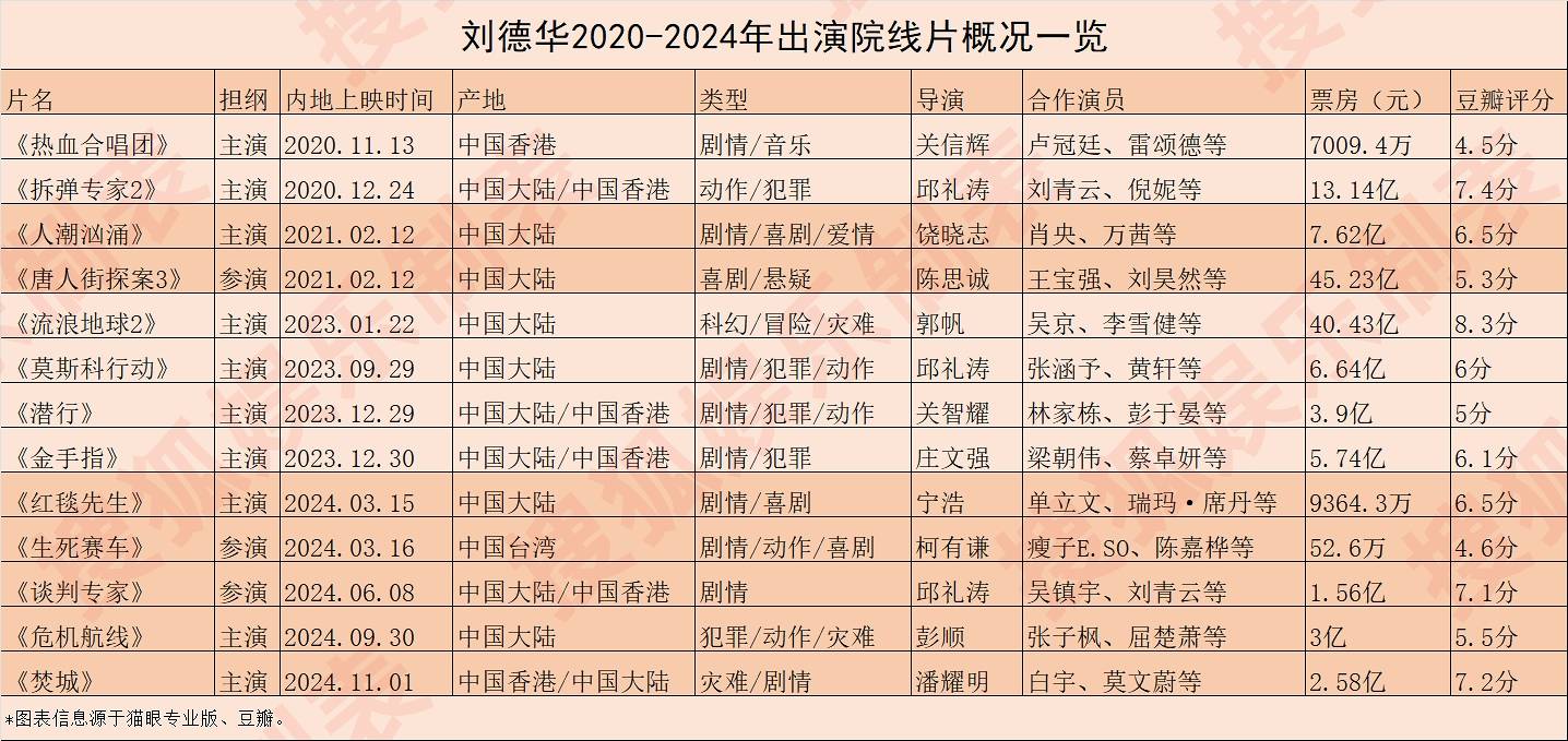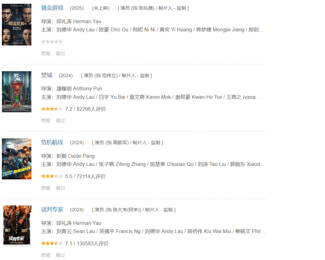 但从2023年开始,刘德华确实进入了一个加速曝光的阶段。2023年上映其主演的电影四部,2024年主演三部、参演两部;其中6分以下的电影三部、6-6.5分的两部;从参演类型看,动作、犯罪类电影就有五部。